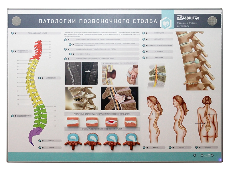 Интерактивный электрифицированный стенд «Патологии позвоночного столба» с натурными образцами наглядно демонстрирует анатомические особенности и патологии позвоночника, помогая глубже понять строение и болезни спины.