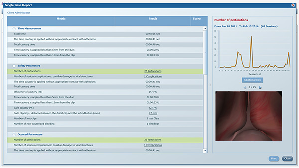 • Оценка по итогам выполнения упражнений включает такие показатели, как время и экономия движений, параметры безопасности диссекции и коагуляции, ошибки и осложнения