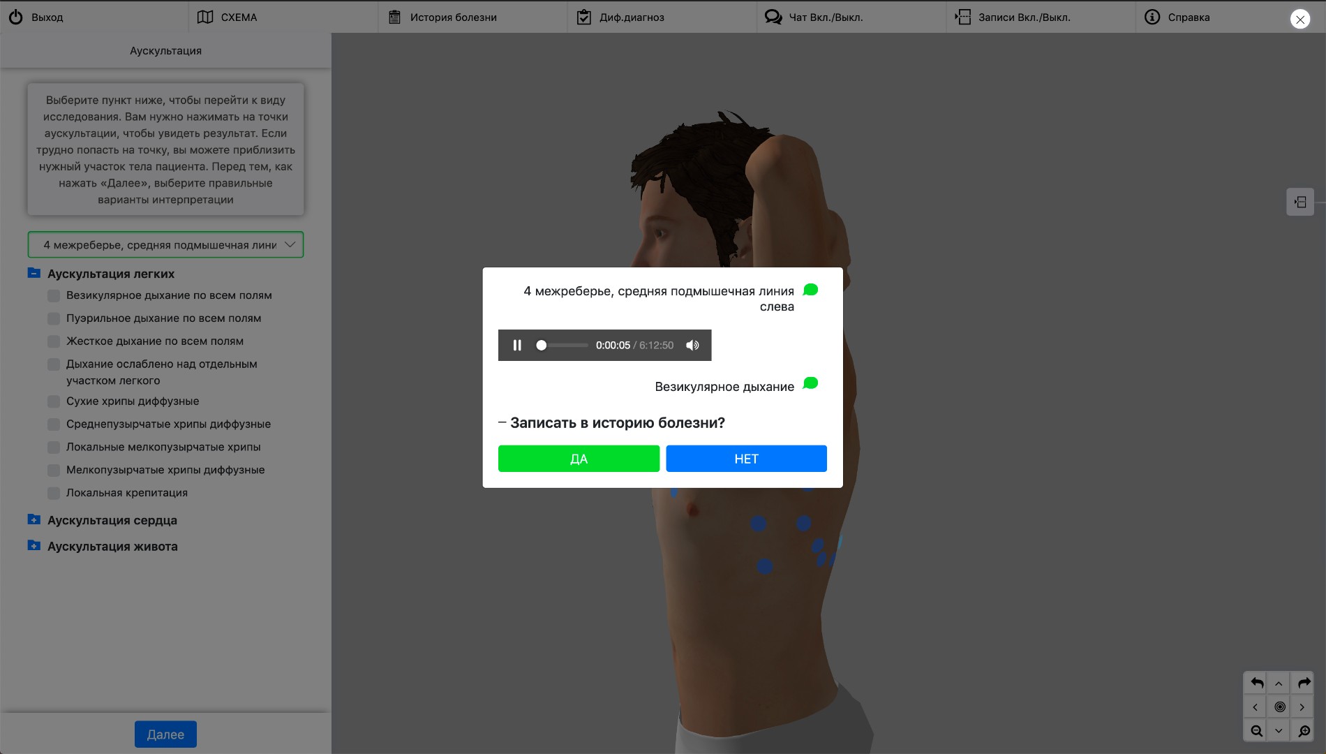 Пользователь имеет возможность указать на стандартные точки на теле ребенка, в которых необходимо провести пальпацию или перкуссию с последующим отображением результата на экране. Этап аускультации сопровождается воспроизведением соответствующих аудиофайлов для каждой выбранной точки.