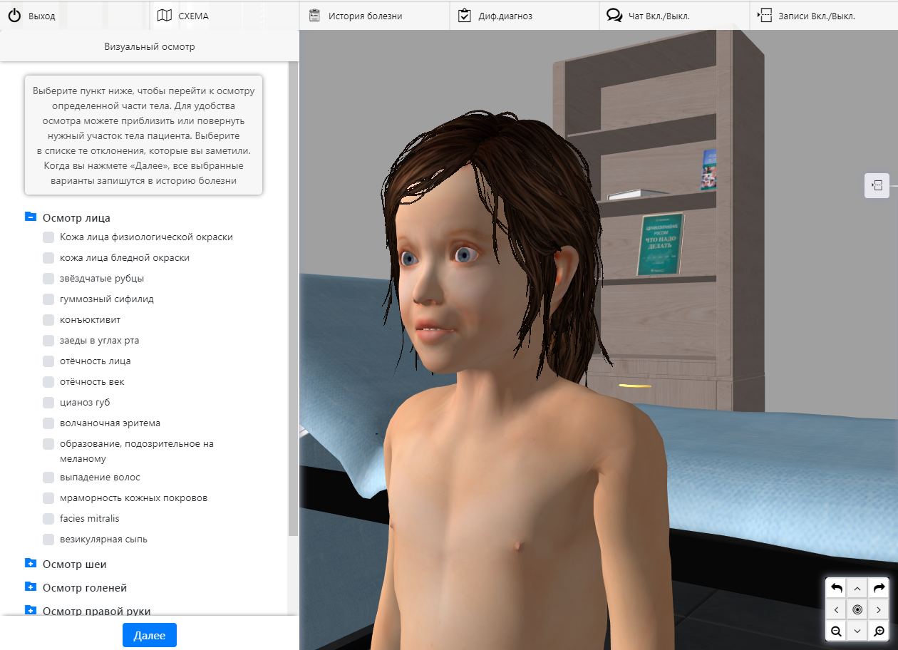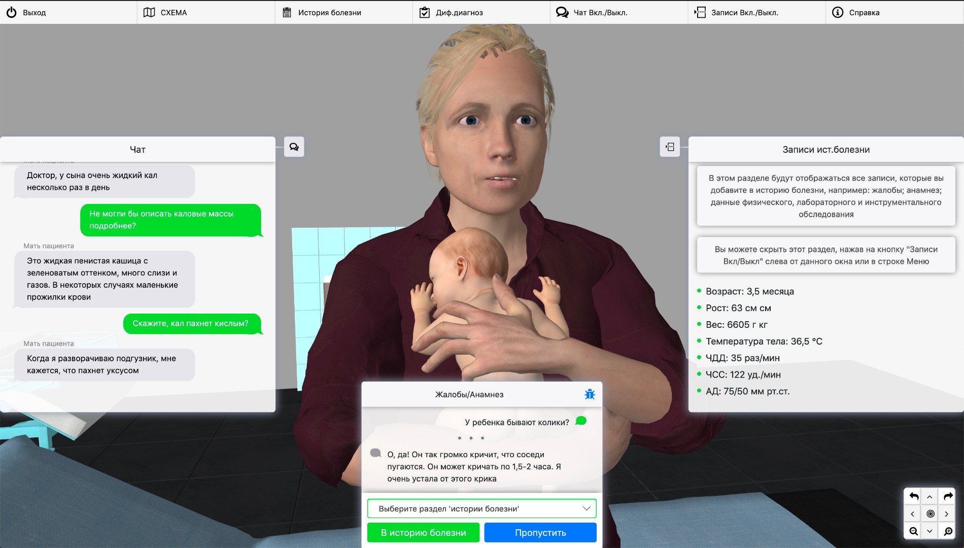 Обследование пациента осуществляется в условиях виртуального кабинета участкового педиатра. Диалог с персонажем реализован в виде текстового чата с возможностью добавления информации в электронную историю болезни.