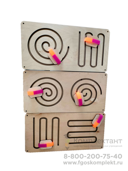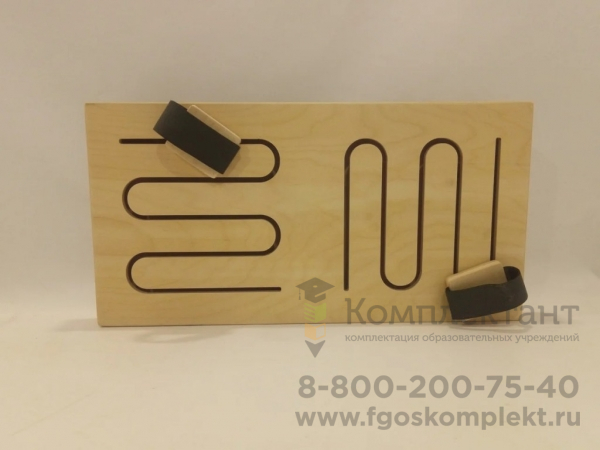 Изделие предназначено для развития двигательных навыков.Панель может устанавливаться как на столе, так и крепиться к стене на удобной высоте.Ребенок надевает крепления либо на руки, либо на ноги, и проводит рукой или ногой от начала до конца лабиринта.