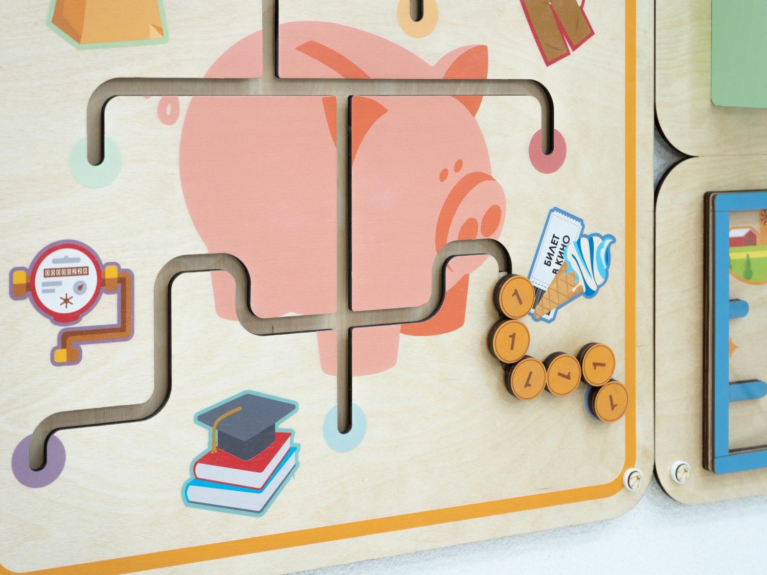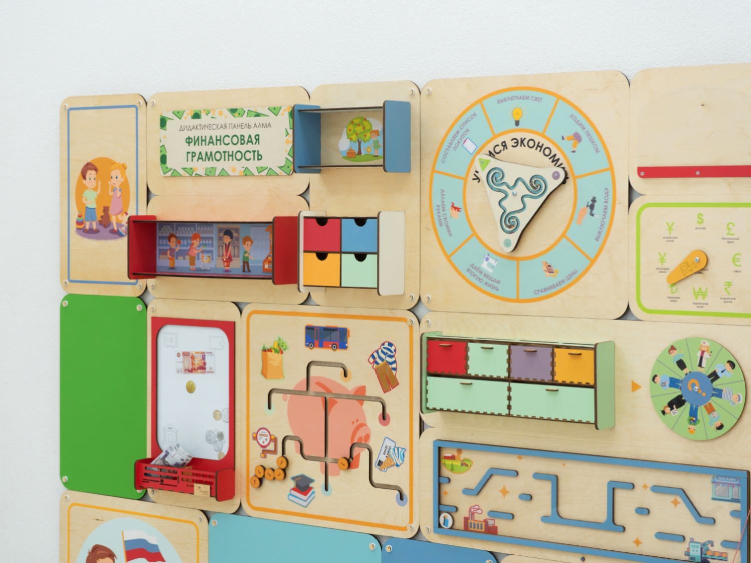 Панель увеличивает площадь полезного развивающего пространства в детском саду. Повесьте её на стену – и она не только станет незаменимым подспорьем в занятиях по финансовой грамотности, но и украсит помещение, скрывая дефекты стен.