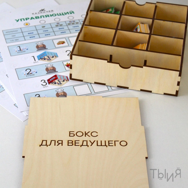 6) Бокс ведущего деревянный с ячейками для игровых элементов;