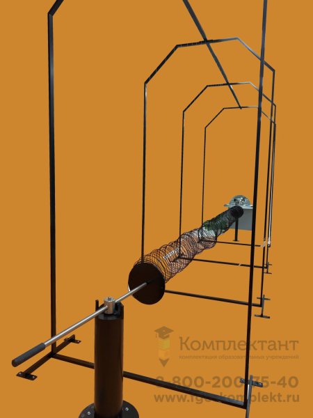 Интерактивный экспонат 1 - демонстрирует распространение и затухание волн. Посетитель приводит экспонат в движение с помощью рукоятки, при этом около рукоятки образуется волна, которая распространяется до хвостового напольного крепления, затем отражается и возвращается к рукоятке. Такое распространение должно наблюдаться до полного затухания волны.