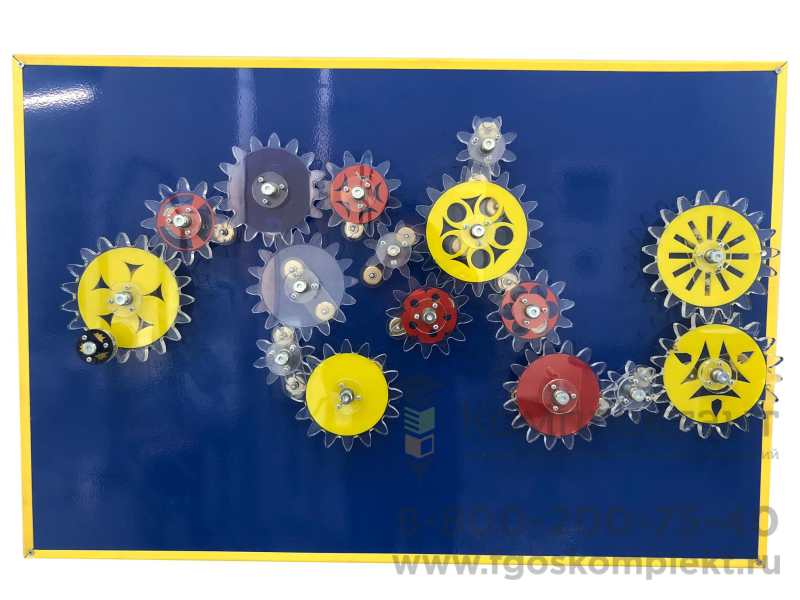 Интерактивный экспонат 4 - демонстрирует передаточное число. При взаимодействии с экспонатом посетитель, задействовав все имеющиеся шестеренки, закрепляет их на рабочем поле таким образом, чтобы вся получившаяся конструкция приводилась в движение любой из шестеренок, входящих в конструкцию, и чтобы при этом крутилась каждая шестеренка.