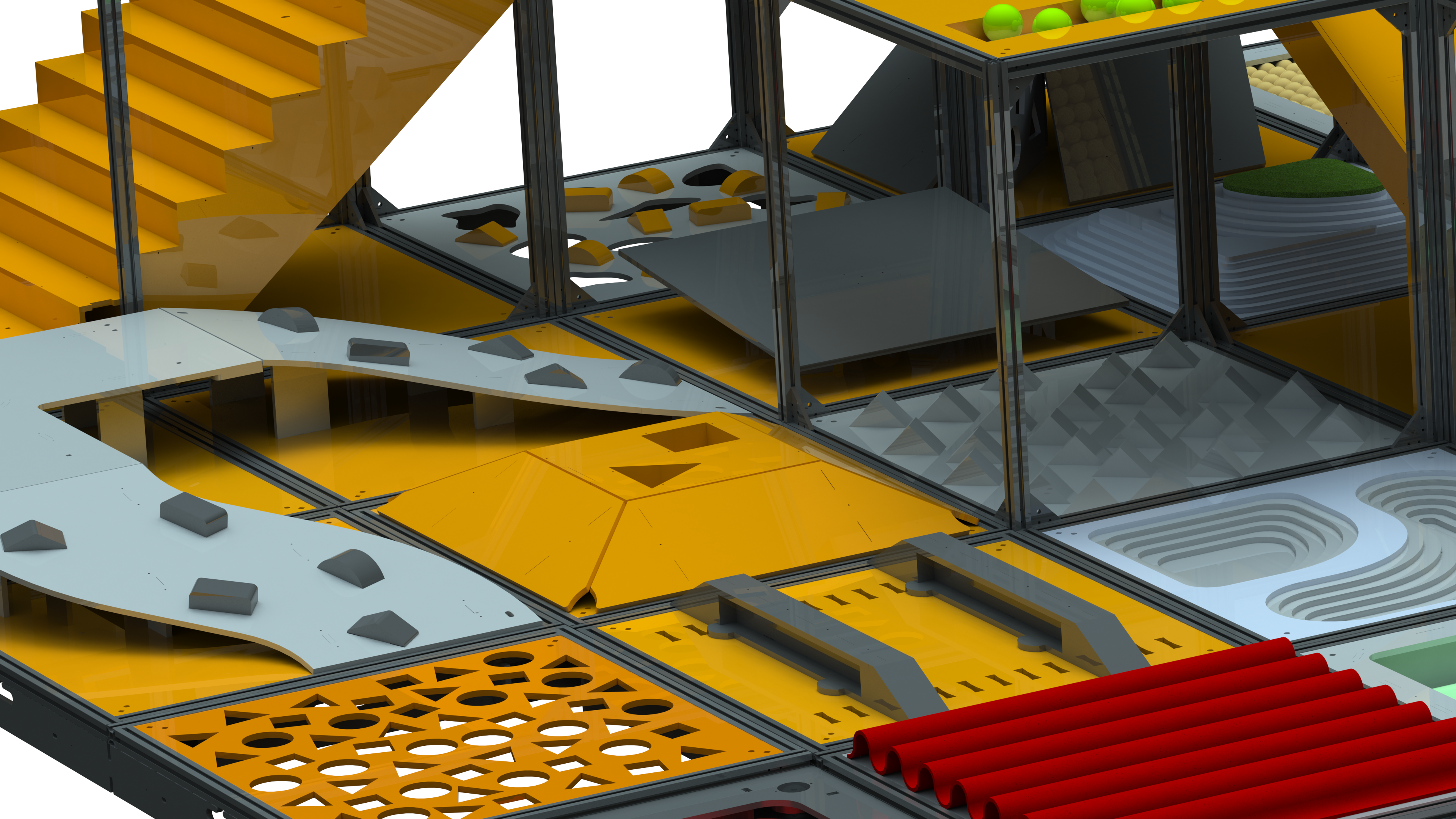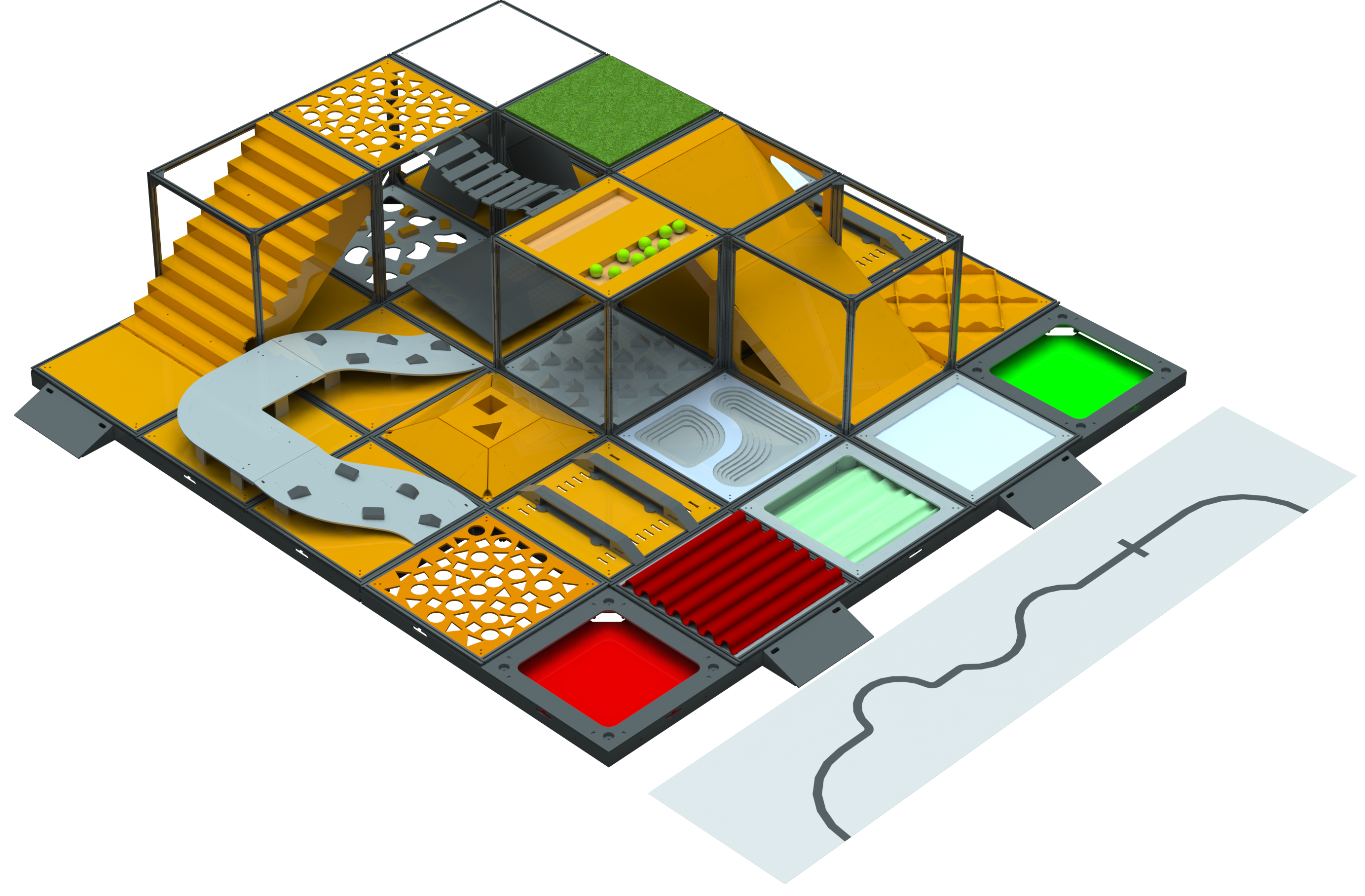 Испытательный полигон «РТК» представляет собой реконфигурируемую полосу препятствий, составными элементами которой являются 25 различных ячеек с испытаниями и заданиями, преодоление или выполнение которых позволяет оценить возможности мобильных роботов.