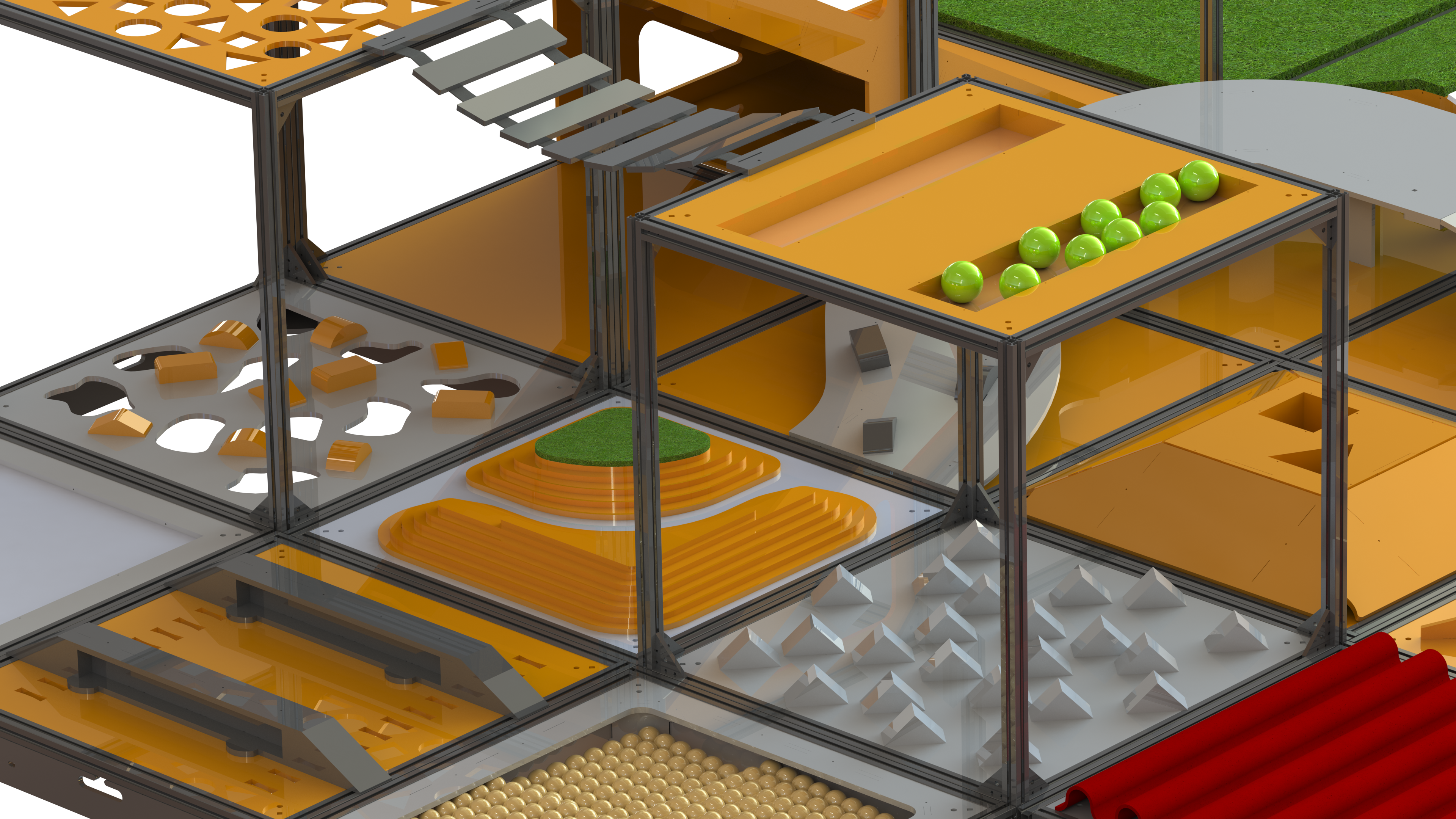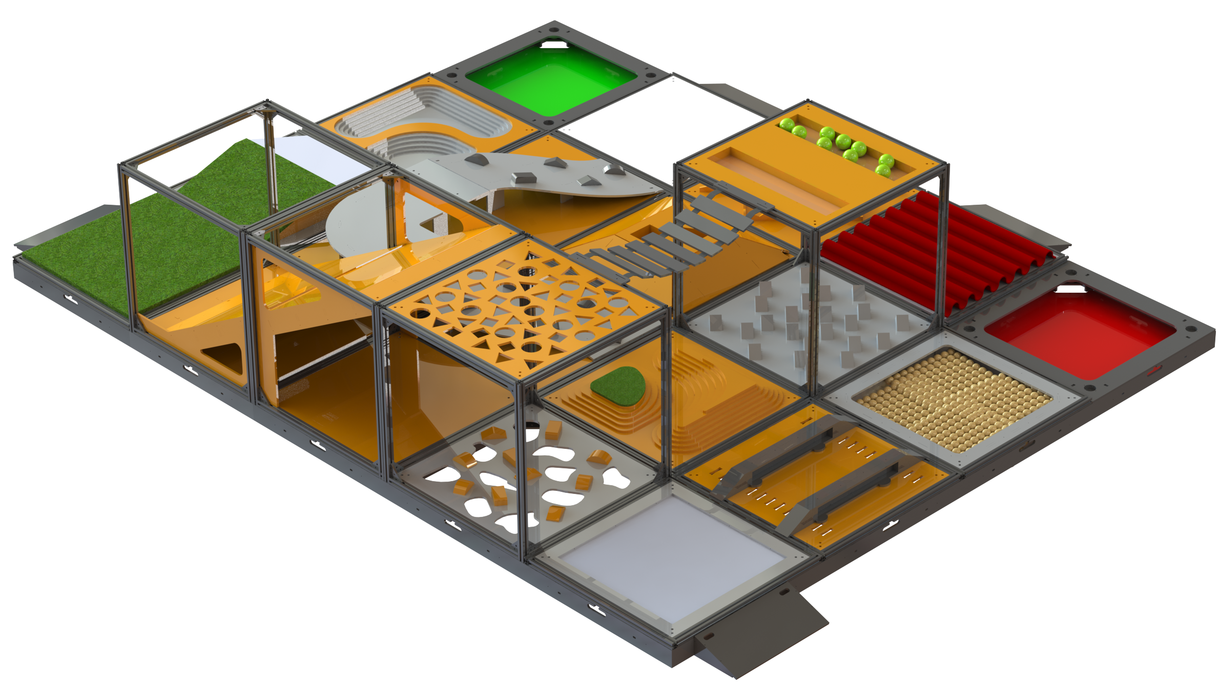 Испытательный полигон «РТК» представляет собой реконфигурируемую полосу препятствий, составными элементами которой являются 20 различных ячеек с испытаниями и заданиями, преодоление или выполнение которых позволяет оценить возможности мобильных роботов.
