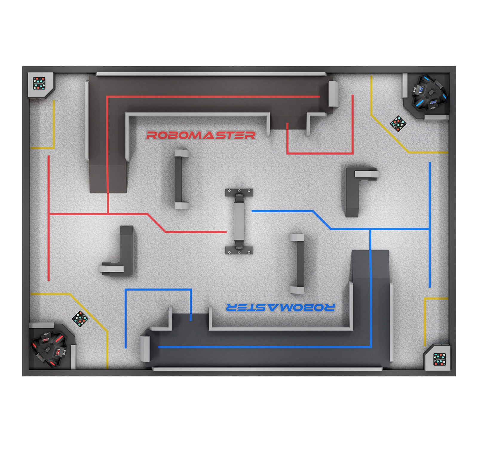 Молодежный турнир RoboMaster - это соревнование по робототехнике, созданное и организованное DJI, направленное на поощрение молодежи развивать свои теоретические инженерные знания и навыки применения искусственного интеллекта. Площадка молодежного турнира разделена на две симметричные зоны Red Team и Blue Team, состоящие из ряда компонентов площадки, включая базы, посадочные площадки, дороги, высокие стены, L-образную местность и остров ресурсов.