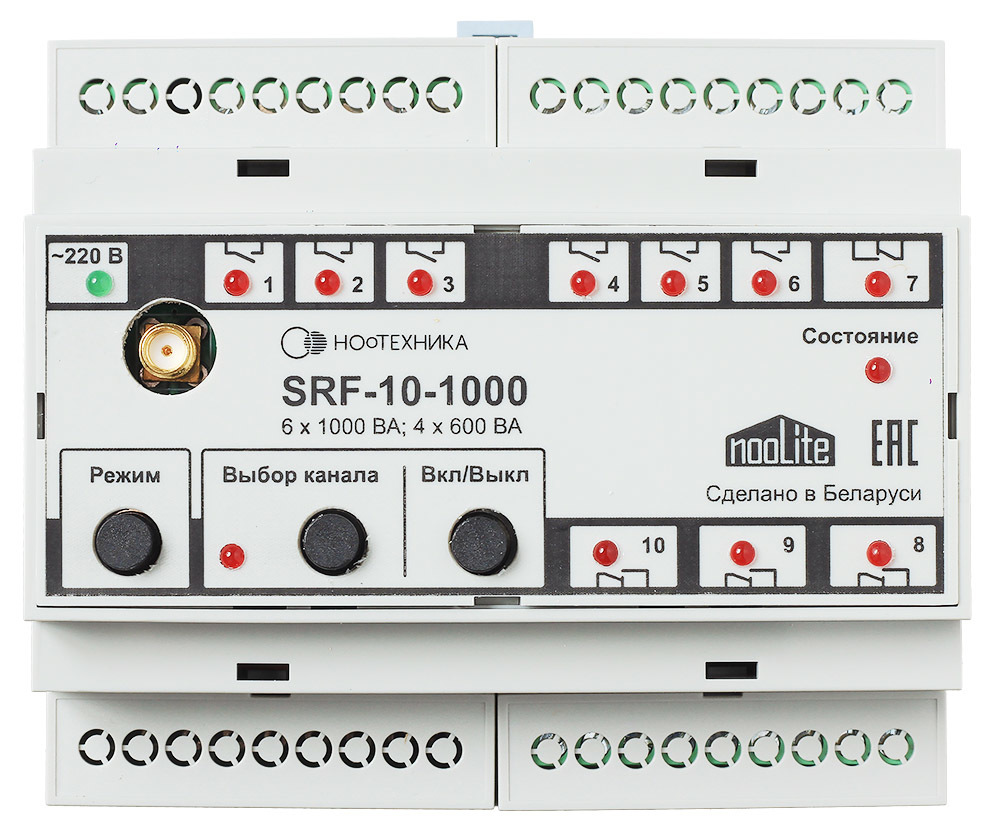 Силовой блок nooLite SRF-10-1000 имеет 6 выходов NO с максимальной нагрузкой до 1000 Вт на каждый канал и 4 NO/NC — по 600 Вт.