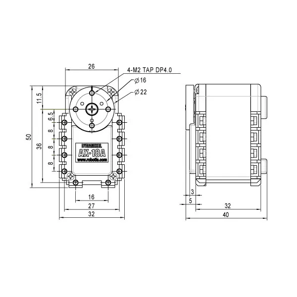 Сервомотор Dynamixel производителя Robotis. Удерживающий крутящий момент 1.8 Нм. Скорость холостого хода 97 об/мин. Интерфейс подключения TTL.