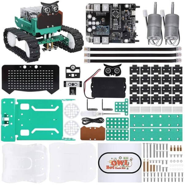 OwlBot Tank Kit With Nano V4 имеет несколько встроенных функций, таких как движение по траектории, заданной линией, детектор препятствий и дистанционное управление, управление светом и звуком. Набор для сборки робота позволяет пользователям познакомиться с графическим программированием. Конструктор идеально подходит для детей и подростков, которые хотят посвятить свою жизнь карьере в сфере высоких технологий.