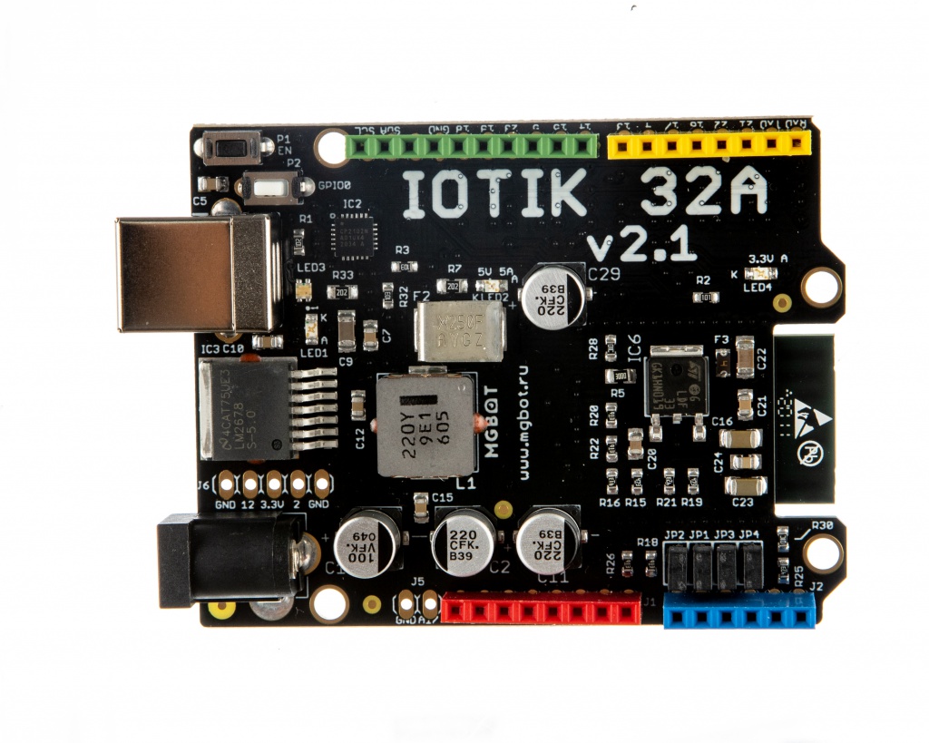 Контроллер "ЙоТик 32А вер. 2.1" имеет в своей основе esp32 микроконтроллер, имеющий встроенный Wi-Fi и Bluetooth. Это позволяет реализовать различные проекты в сфере IoT без применения дополнительных модулей для подключения к платформам Интернета вещей.