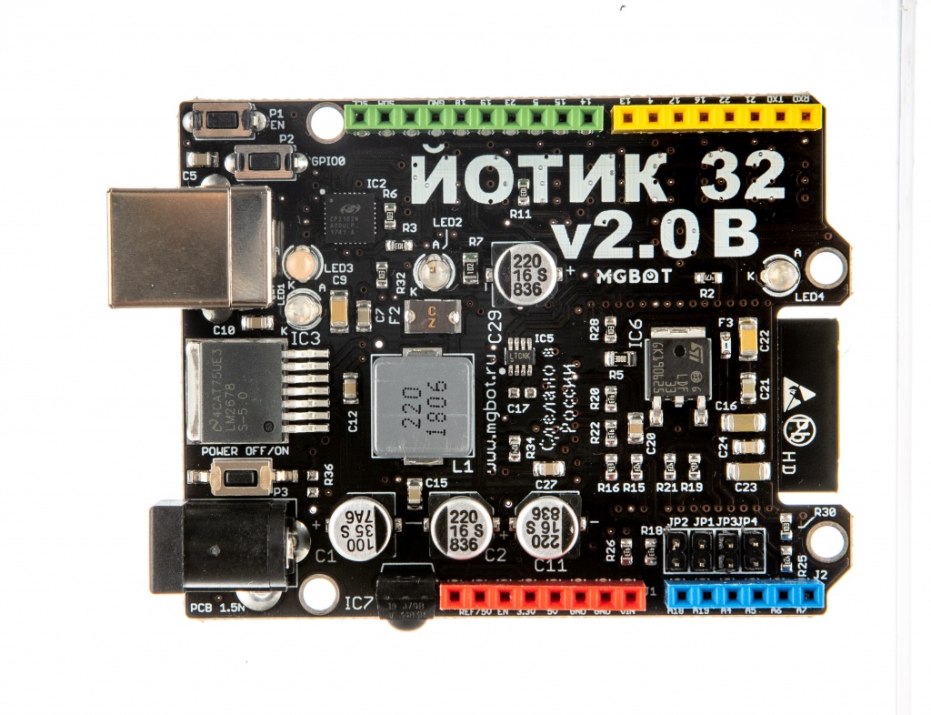 Контроллер "ЙоТик 32В" имеет в своей основе esp32 микроконтроллер, имеющий встроенный Wi-Fi и Bluetooth. Это позволяет реализовать различные проекты в сфере IoT без применения дополнительных модулей для подключения к платформам Интернета вещей.