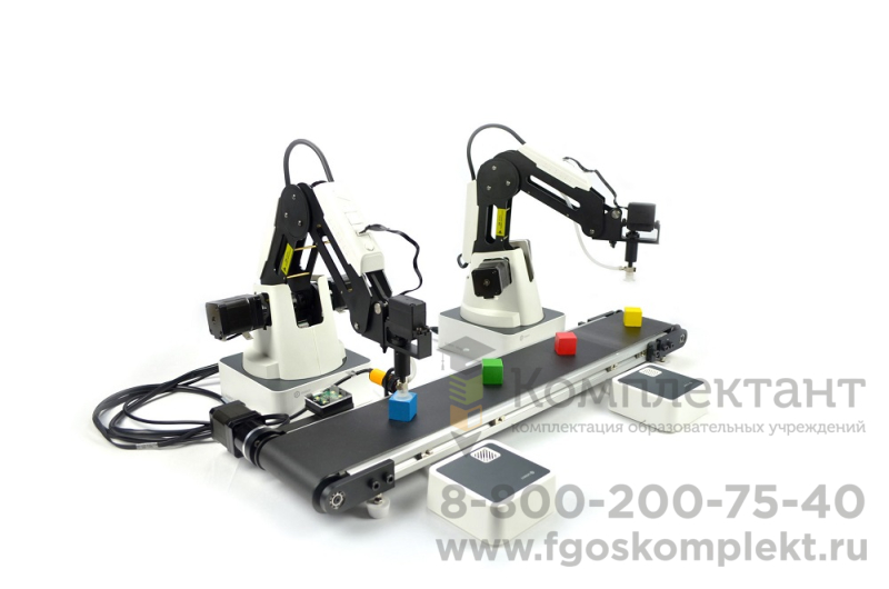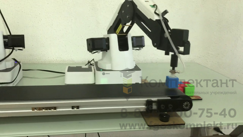 Фотоэлектрический выключатель позволяет определить наличие объекта на ленте, а датчик цвета позволяет классифицировать объекты по цветам. Деревянные кубики используются для демонстрации захвата, перемещения и складирования.