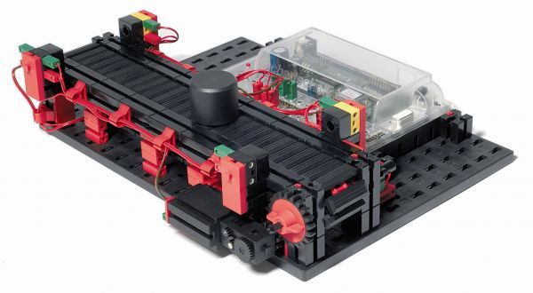 Учебная модель в комплекте с контроллером ROBO TX. Длина транспортера 275 мм. Диаметр перемещаемых деталей до 29 мм. Несколько конвейеров можно объединить вместе для увеличения общей длины. Модель собрана на основании fischertechnik 500. Для управления используется установленный на модели программируемый контроллер ROBO TX.