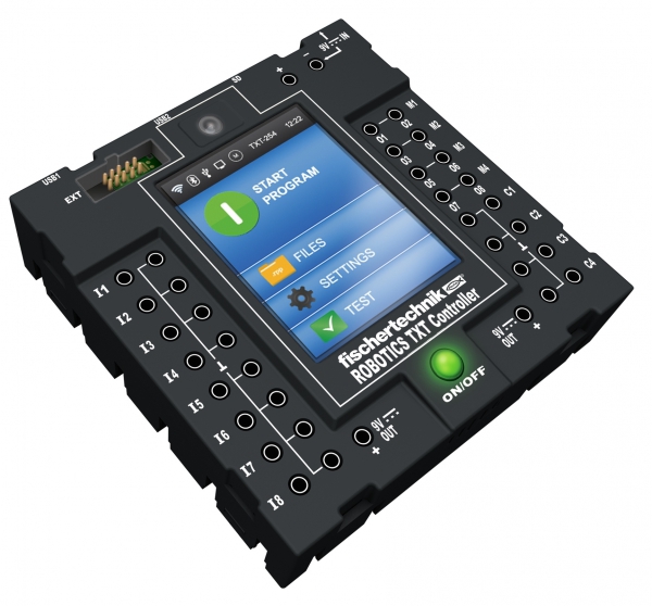 Новый программируемый контроллер ROBOTICS TXT работает под управлением ОС Linux. Он оснащен цветным сенсорным дисплеем и имеет встроенный комбинированный модуль Bluetooth/WiFi, который обеспечивает надежную связь с различными устройствами и приложениями. Программирование контроллера осуществляется в среде ROBO Pro или на языках С, С++, С# и VB.