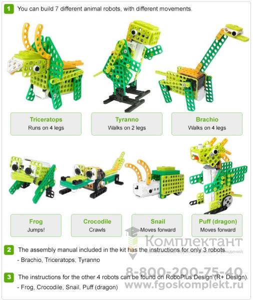 Включает инструкцию по сборке только 3 моделей динозавров. Виртуальную 3D-инструкцию по сборке всех типовых моделей роботов можно найти в приложении R+ Design для ПК или его мобильных версиях для Android и iOS, которые доступны для скачивания в Google Play и AppStore.