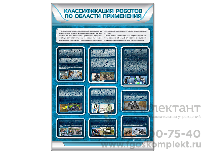 Стенд "Классификация роботов по области применения" – наглядное пособие для изучения современных технологий. Идеально подходит для школ и вузов, помогает понять разнообразие робототехники и ее применение в разных сферах.
