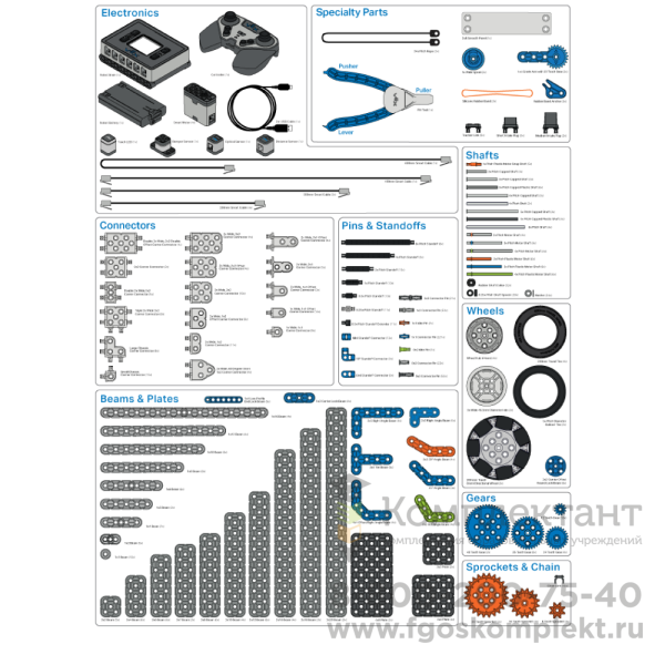 - Контроллер управления (12 портов, цветной экран, кнопки для навигации в меню, встроенный инерционный датчик, Bluetooth)