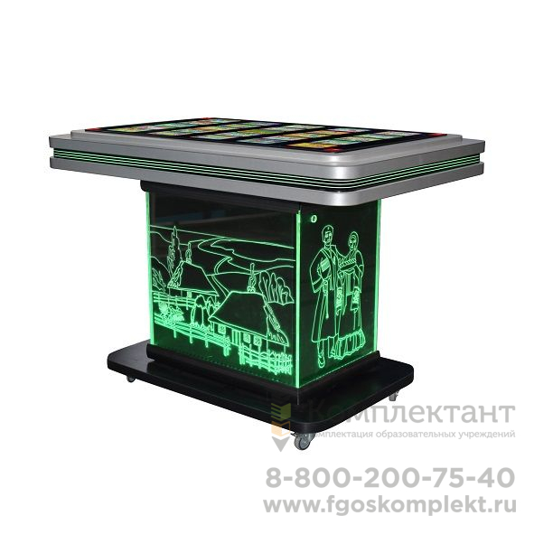 • Дизайнеры НФИ украсили корпус интерактивного стола тематической гравировкой, которая может быть изменена по пожеланиям заказчика, а конструкторы обеспечили гравировке RGB подстветку.