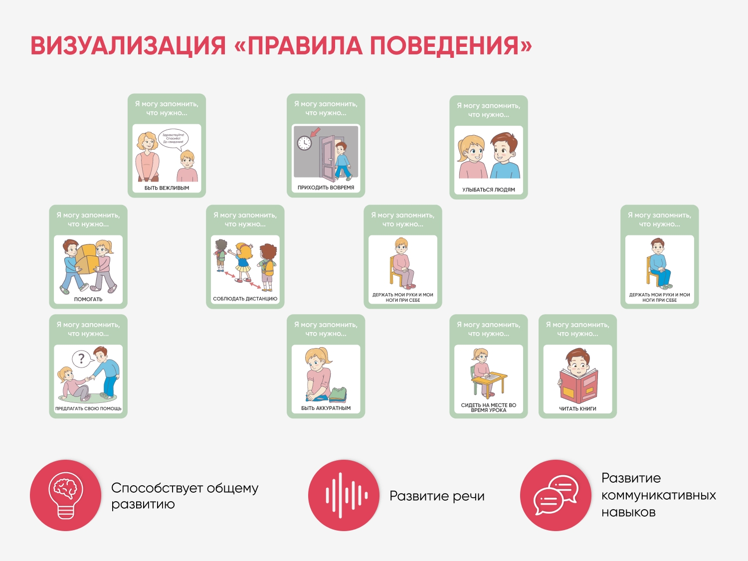 Визуальное подкрепление правил поведения помогает лучше понять и запомнить то, что ожидается от человека. Для детей с трудностями обучения и РАС важно, чтобы правила содержали то, что нужно делать, а не то, чего не стоит делать, например: говорить по очереди (вместо «не перебивать»). Вариант для мальчика и для девочки.