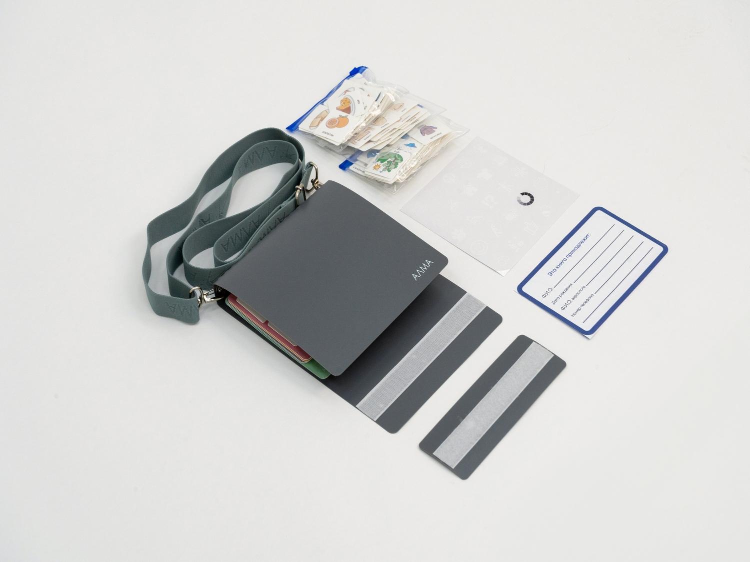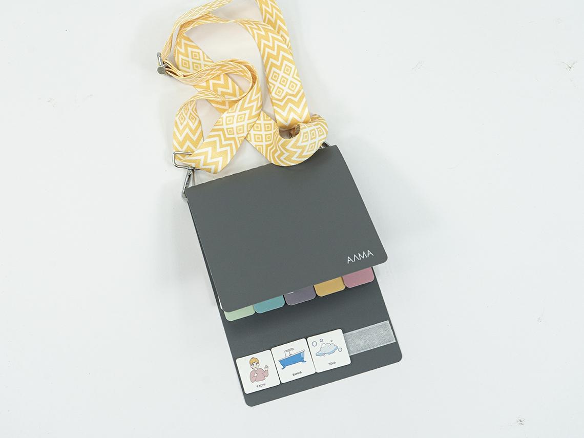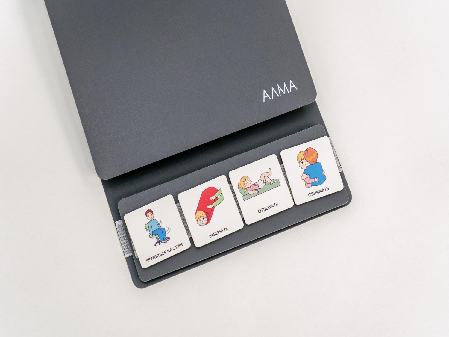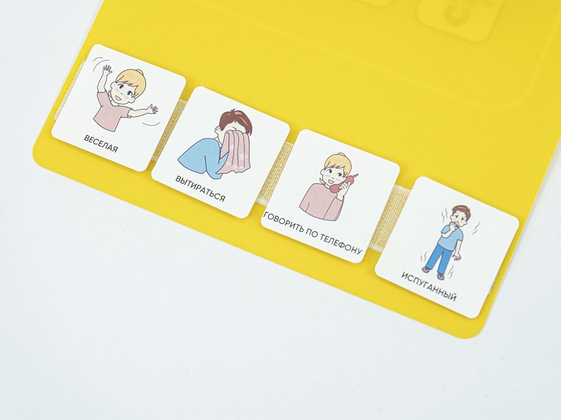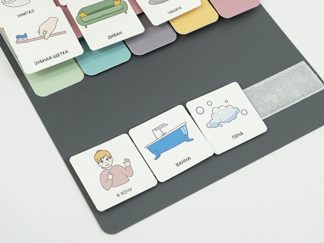 Снизу папки выступает коммуникативная полоса, она сделана так, чтобы карточки на ней всегда были перед глазами ребёнка. Это своеобразная мессенджер-строка, куда ребёнок перемещает нужные ему карточки из общей папки и выстраивает предложение.