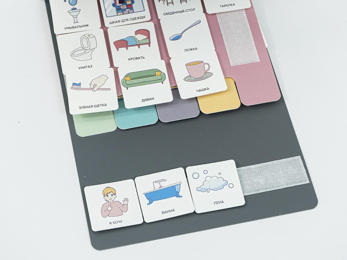 Тематические наборы, которые включены в базовый комплект: одеваюсь, игрушки, поликлиника, дом, ягоды и фрукты, еда, улица, действия, что нельзя делать, школа,  состояние человека, детская площадка, части тела, питомцы, животные, поощрения.