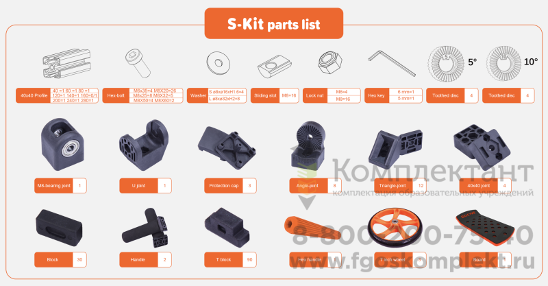 Вам не нужно иметь специальные инструменты, или собственную мастерскую, чтобы собирать Docyke. В комплекте Вы получаете все необходимое для создания крутых конструкций: алюминиевые профили, пластиковые соединительные элементы различных форм, болты, гайки, колёса, инструменты для сборки и многое другое.