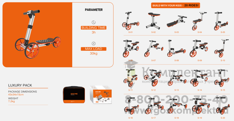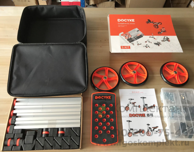 Получите увлекательный опыт вместе со своими детьми, строя разные средства передвижения. Все комплекты DOCYKE полностью совместимы между собой. А детали конструктора выполнены из материалов с повышенной устойчивостью к нагрузкам. Максимально допустимая нагрузка зависит от типа конструктора, для DOCYKE S-KIT - 30кг. Не менее 20 вариантов сборки, количество ограничивает только ваша фантазия. Конструктор DOCYKE объединит всю семью созданием необычного транспорта. В комплект входят соединители, алюминиевые профили, винты и 4 колеса диаметром 20 см.