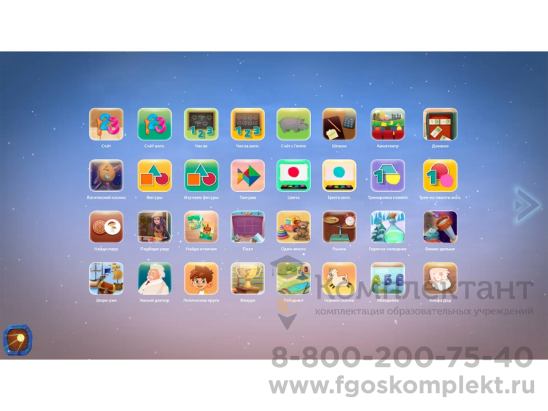 Уникальное программное обеспечение, включающее более 80 обучающих игр и 110 тестов, направленных на развитие памяти, внимания, логики, изучение счета и английского языка. Также в программное обеспечение входят приложения: рисование, раскраски, шахматы и шашки. Прохождение всех игр способствует расширению у ребенка знаний об окружающем его мире.