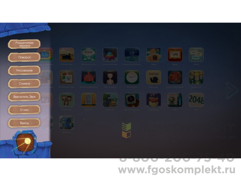 Присутствует функция разделения экрана на 2-4 игровых сектора (до 8 детей за одним устройством).