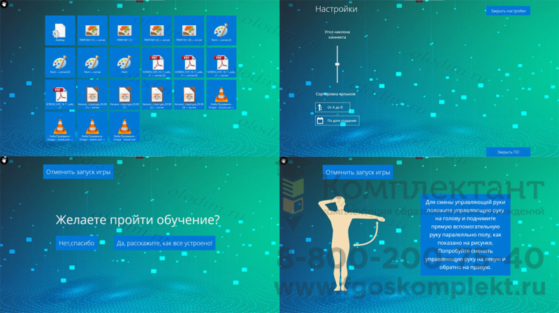 Программная оболочка позволяет добавлять, отображать, открывать и производить работу с файлами и приложениями всех форматов, поддерживаемых ОС Windows 10, в ней имеется поддержка отдельных жестов: нажатия левой и нажатия правой кнопки мыши, управления положением курсора по средством перемещения в пространстве руки.