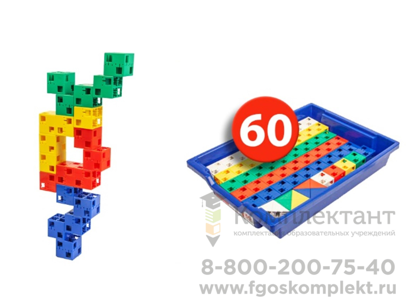 В состав набора входит 60 элементов — по 5 крупных кубиков (4 х 4 х 4 см) пяти цветов и 10 треугольных полукубиков пяти цветов. Комплект снабжён карточками для изучения 9 тем с 219 заданиями трёх уровней сложности.