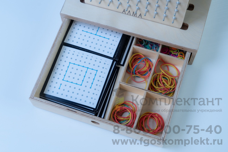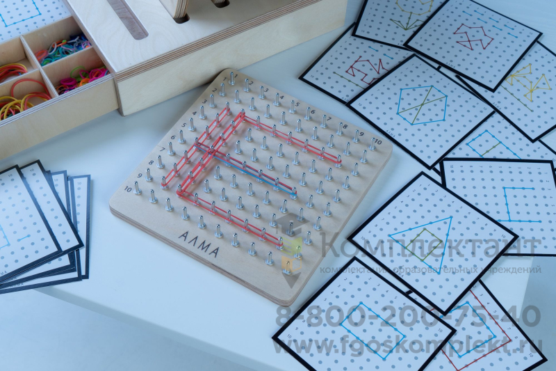 Математический комплекс состоит из 5 геобордов, включая карточки с заданиями, методические рекомендации, набор цветных резинок.