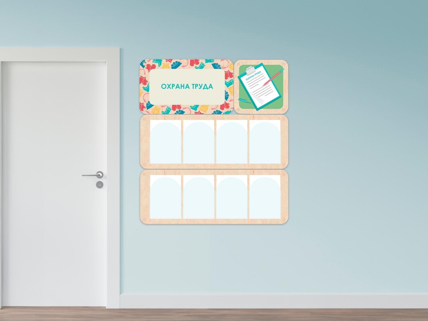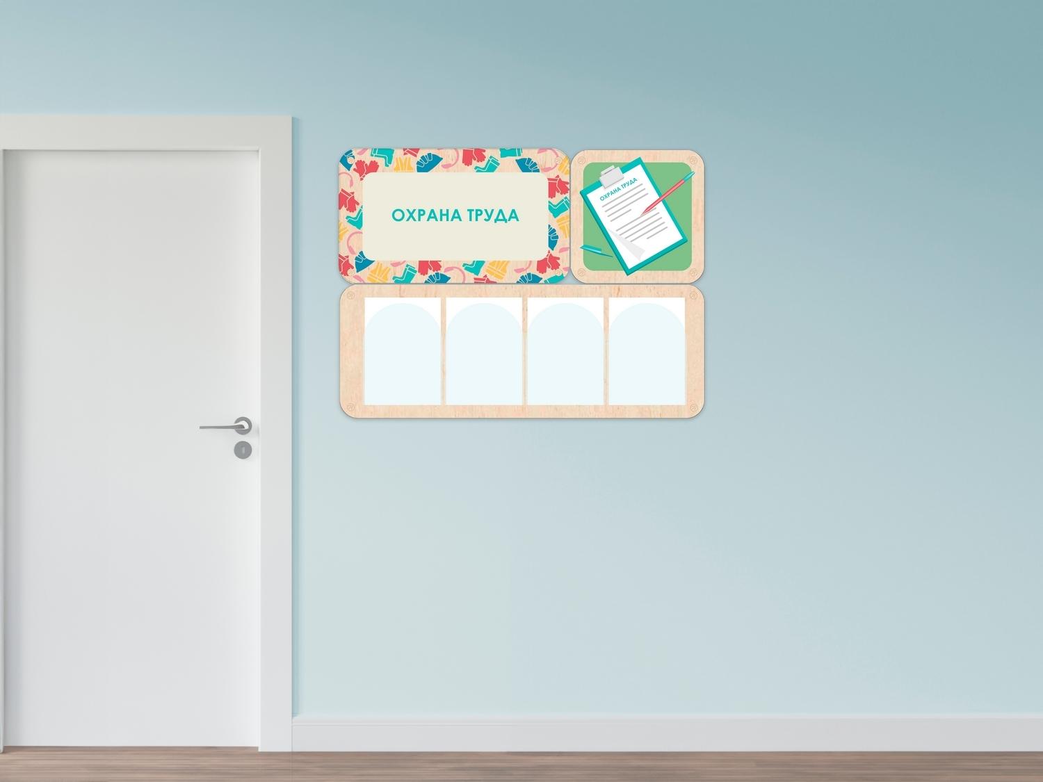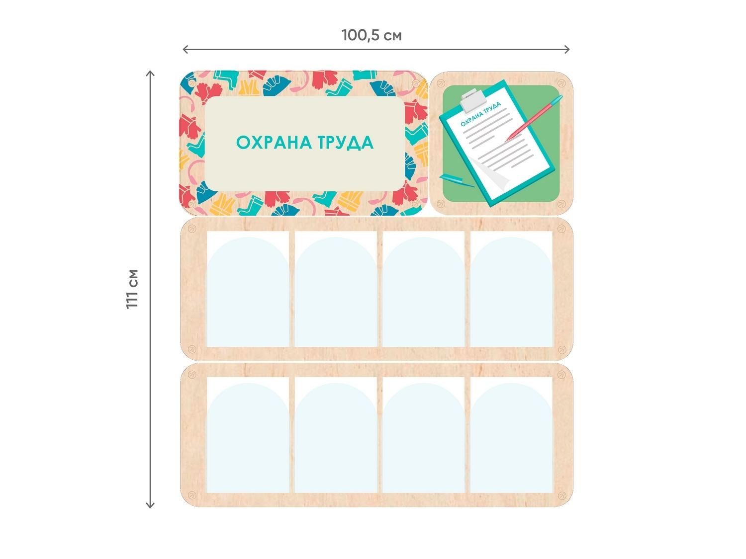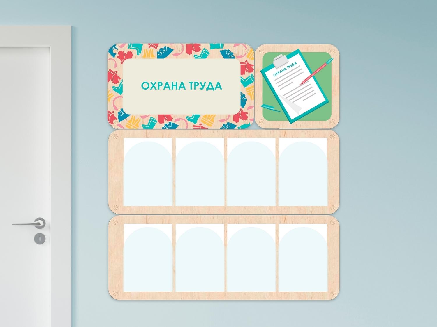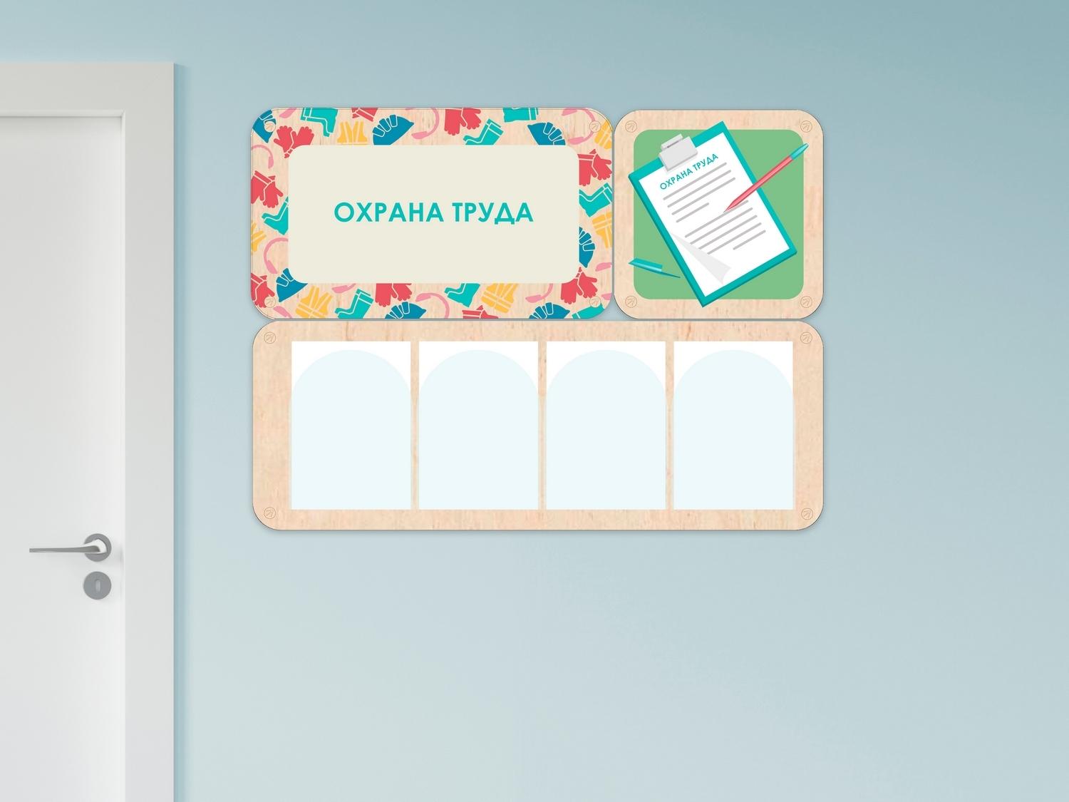 Стенд информации для детского сада, который рассказывает детям и родителям важные сведения об охране труда в учебном заведении. В акриловых карманах можно разместить документацию, регламенты, правила и многое другое. Яркий заголовок акцентирует внимание посетителей на этой информации.