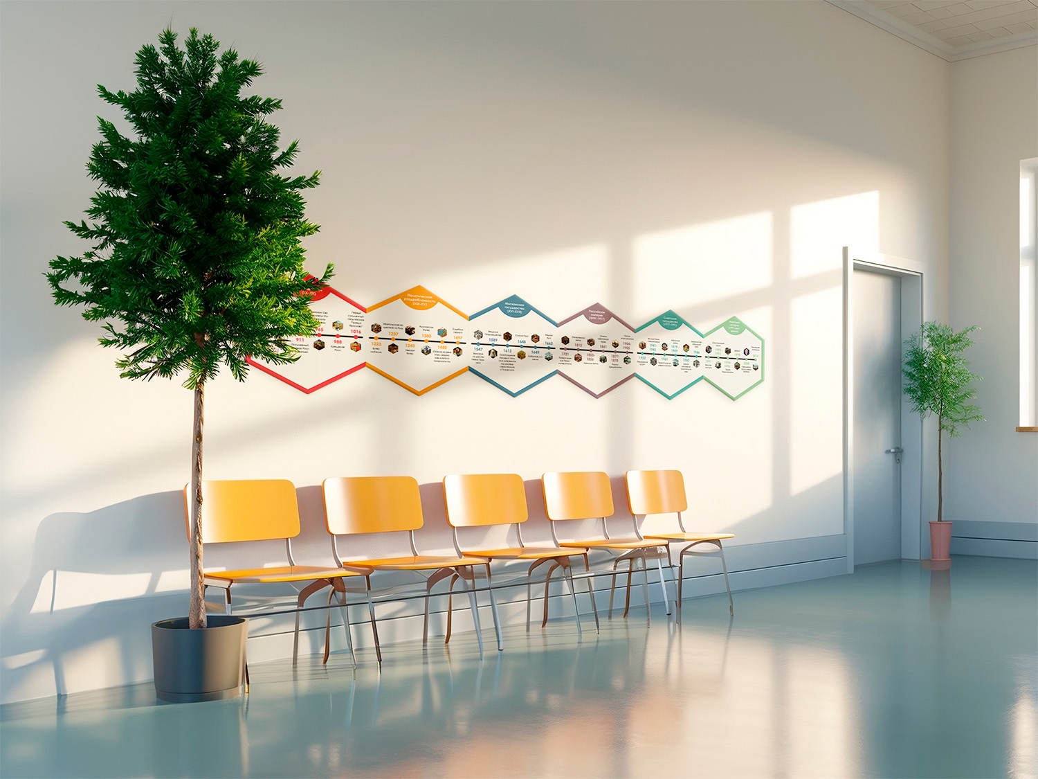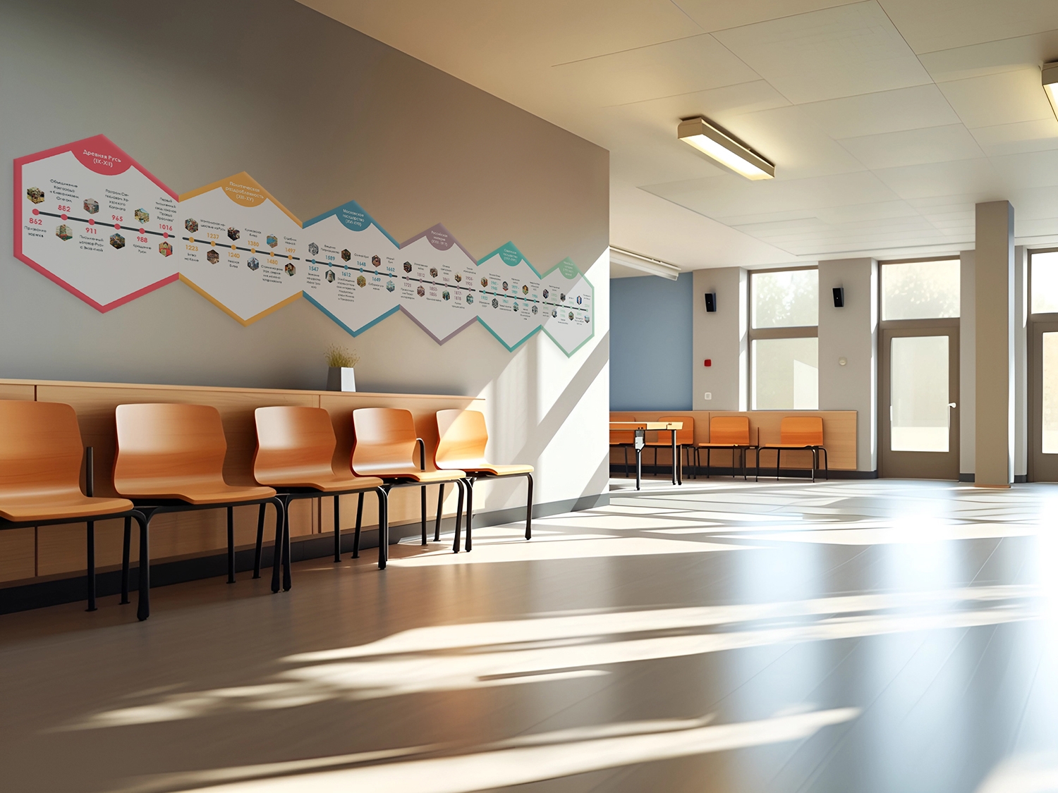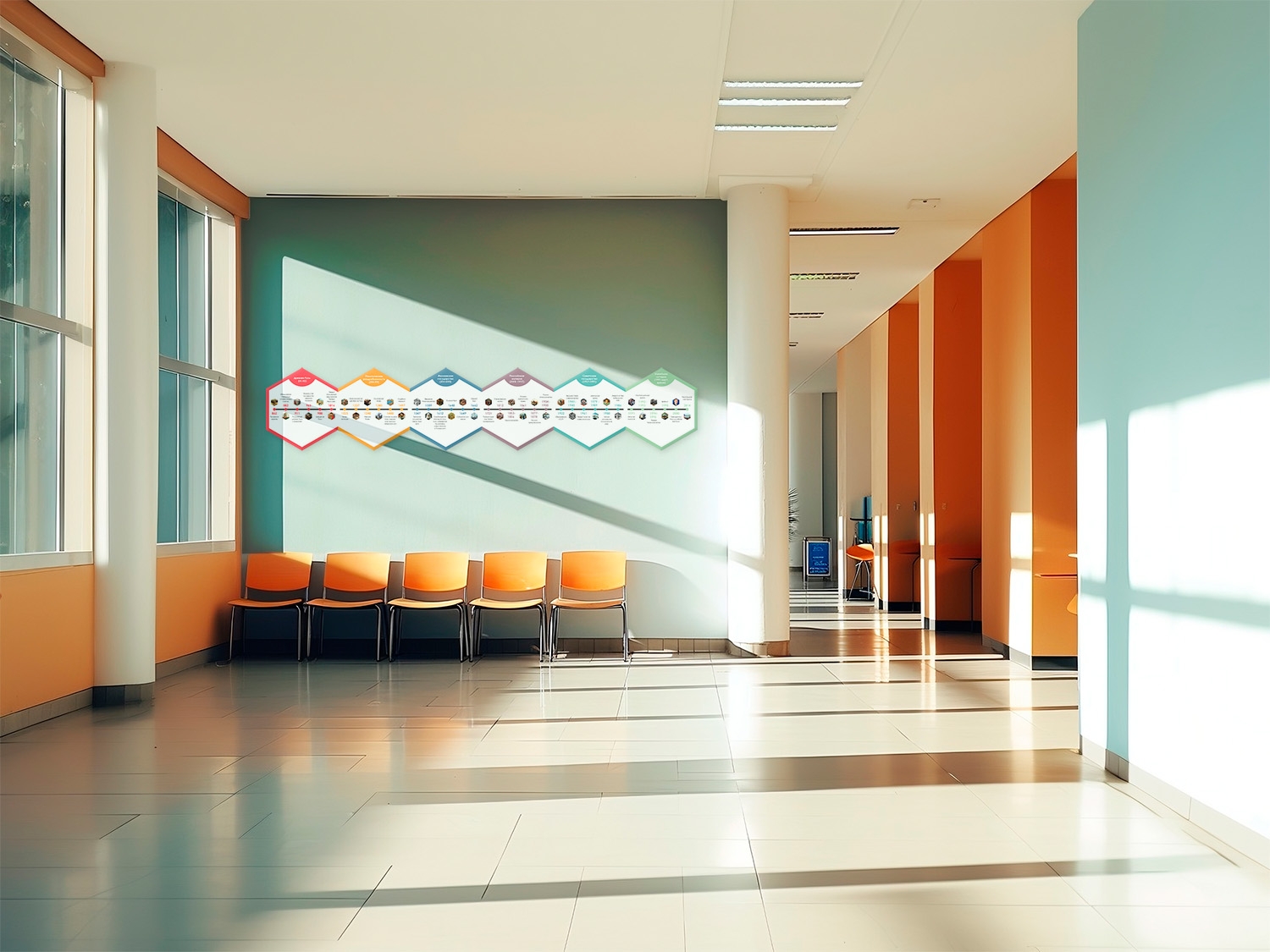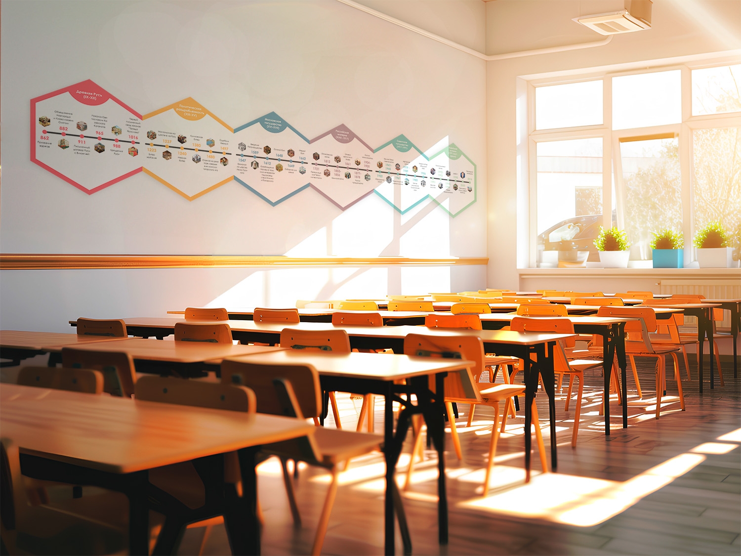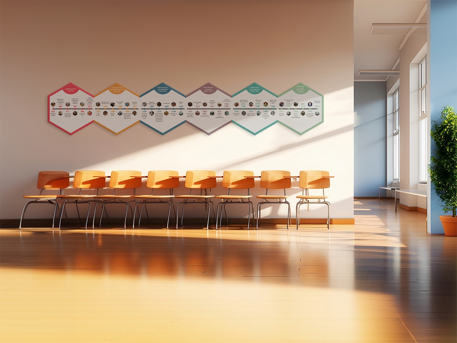 Набор «Лента времени» представляет собой комплект гексагонов одного размера, которые идут в хронологической последовательности. Панели можно размещать в классах, холлах, коридорах, зонах отдыха учебного заведения, где они будут выполнять декоративную и обучающую функции, расширять образовательную среду.