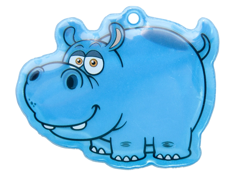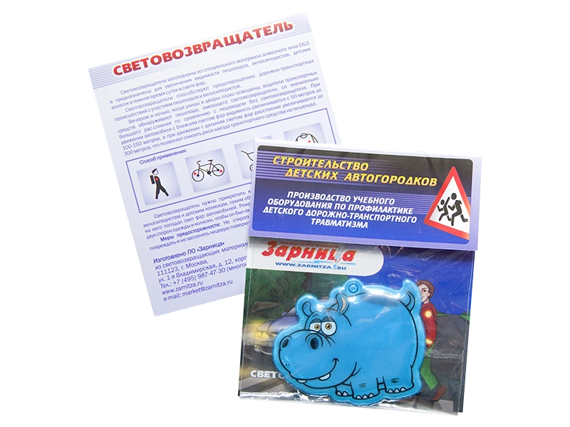 Световозвращающая подвеска высокого качества представляет собой элемент в виде бегемотика, выполненный из скрепленного между собой эластичного световозвращающего материала. Коэффициент световозвращения поверхности подвески составляет 200 кд/лк*м2 согласно требованиям ГОСТ Р 50971-2011. Цвет световозвращающего материала - голубой. На лицевой стороне подвески с применением УФ-печати нанесен цветной тематический рисунок, соответствующий возрастной категории (дошкольники и школьники): "Бегемотик".