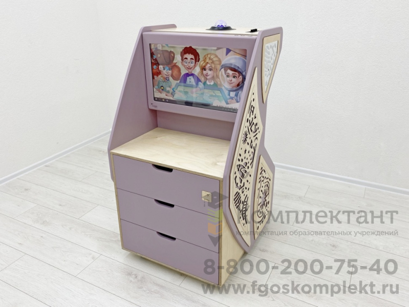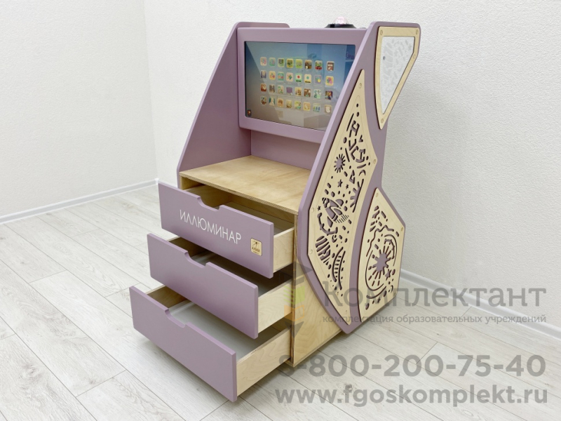 Эргономика «Иллюминара» продумана до мелочей: экран сенсорной панели располагается на удобной высоте для ребёнка, под сенсорной панелью три выдвижных ящика для игрушек и методического материала, на выступающей столешнице ящика можно рисовать, собирать конструктор, заниматься с дополнительным оборудованием, а можно облокотиться на столешницу, выполняя увлекательные задания на экране.