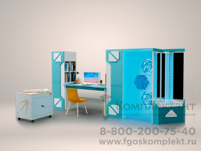 Комплекс включает встроенную световую песочницу, место под конструирование с мягким магнитным конструктором «МАККИ 37», место психологической разгрузки с фиброоптическим душем и воздушно-пузырьковой колонной, встроенную музыкальную систему и многое другое.