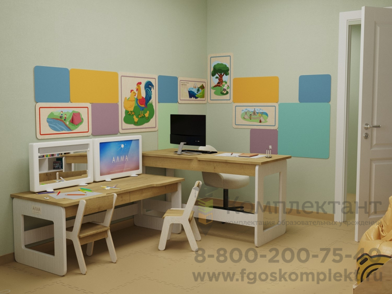Готовый комплект содержит: стол психолога-дефектолога, рабочий стол для детей, компьютер специалиста с программным обеспечением для психологов «Профиль психолога АЛМА», интерактивную сенсорную панель с набором общеразвивающих программ для дошкольников, дидактическую панель «Гармония», кресла-мешки, набор корпусной мебели, нейротренажеры, методические материалы, обучающие пособия и многое другое.