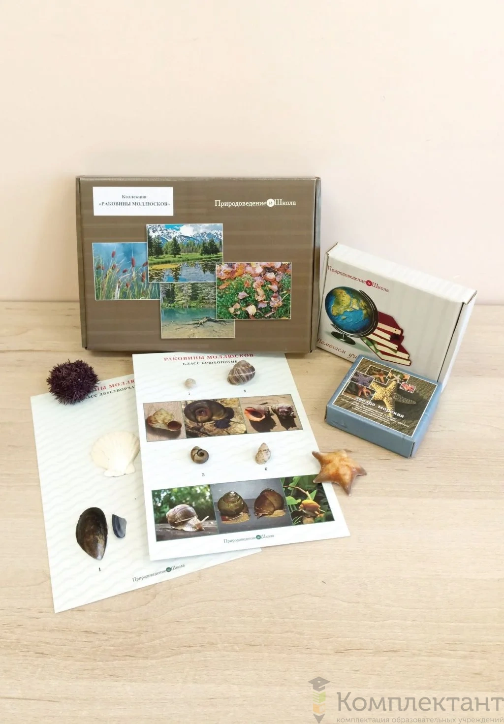 3) Коллекция «Раковины моллюсков». Коллекция содержит 8 образцов раковин моллюсков. Образцы наклеены на 2 цветных заламинированных планшета формата А4. Первый планшет с представителями класса брюхоногие, второй планшет с представителями класса двустворчатые.