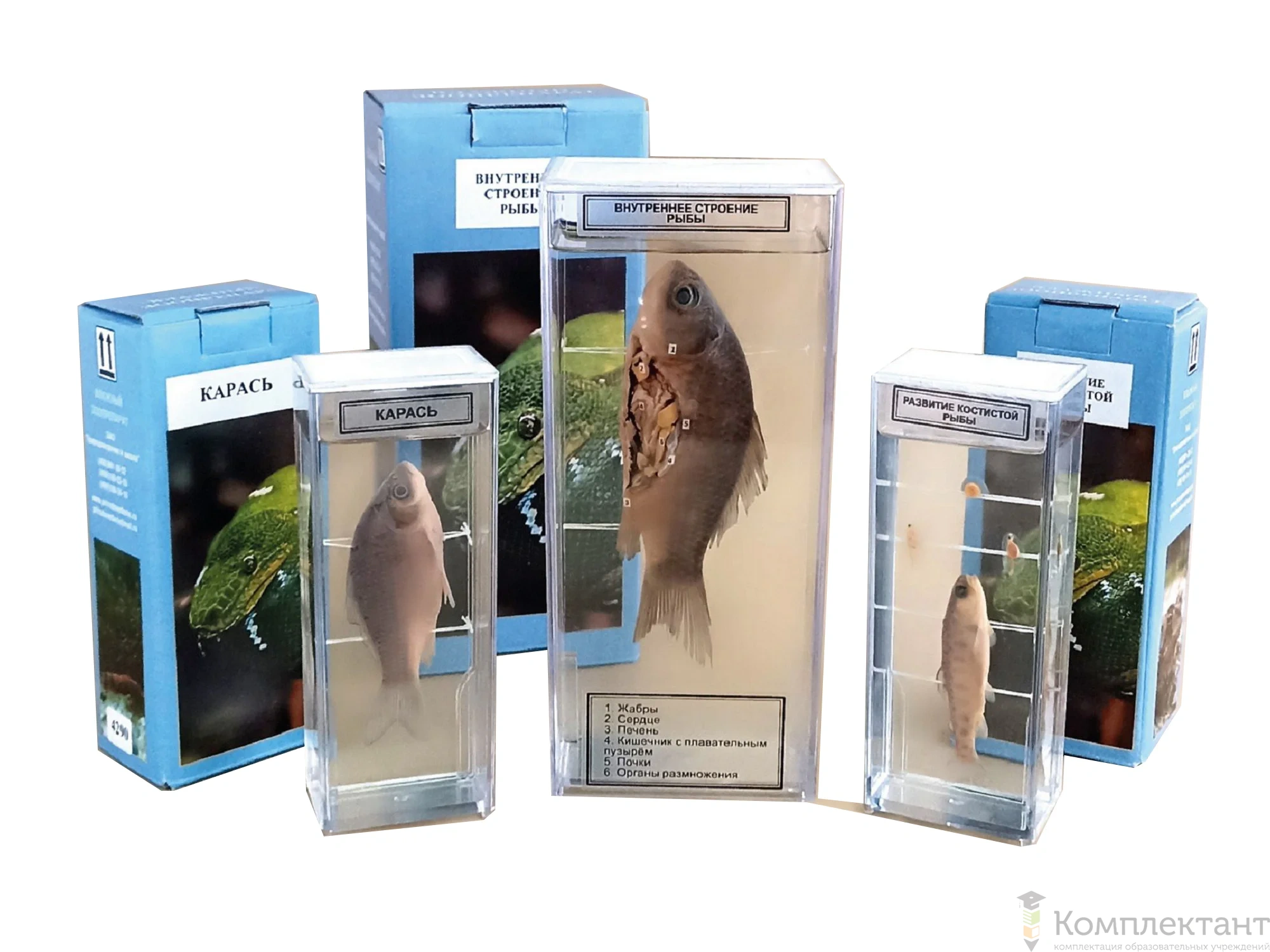 3) Влажный препарат «Развитие костистой рыбы». Препарат представляет собой костистую рыбу, смонтированную на стеклянной пластине, которая помещена в сосуд с консервирующей жидкостью. Пластина закреплена в пазах сосуда и крышки. Сосуд герметично закрыт. На препарате можно рассмотреть особенности внешнего строение и стадии развития костистой рыбы.