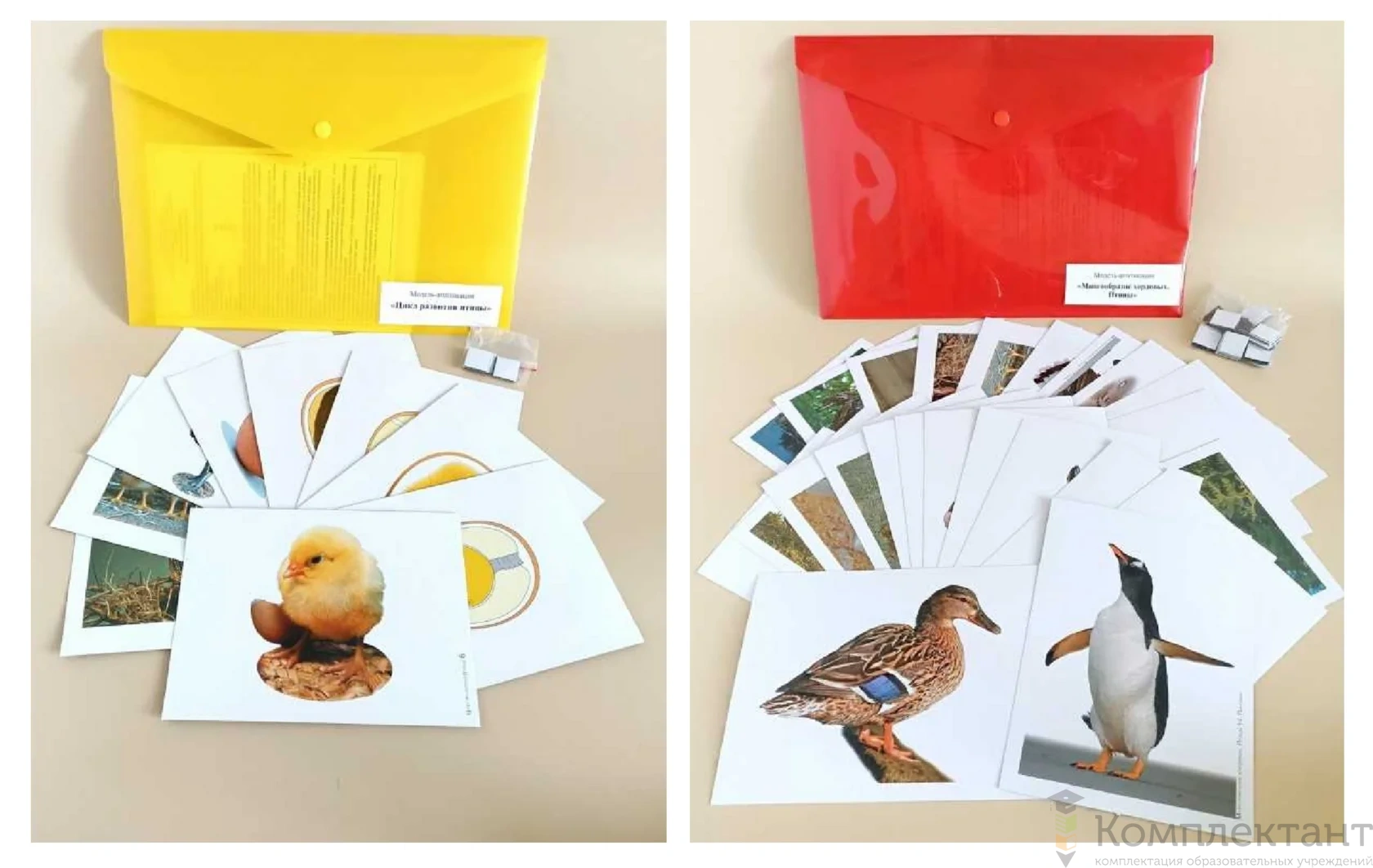 В состав комплекта входят 2 модели-аппликации: Модель-аппликация Многообразие хордовых. Птицы; Модель-аппликация Цикл развития птицы. Модели-аппликации входящие в комплект заламинированы и снабжены магнитными креплениями.