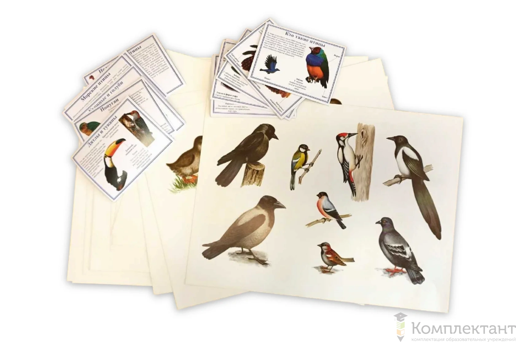 2) Набор раздаточных карточек «Птицы» (формат 150×200 мм.) — 20 шт. На карточках изображены разные виды птиц — дикие, домашние, декоративные, а также — особенности их строения, гнездования, выведения потомства, взаимоотношений. Упаковка — наличие.