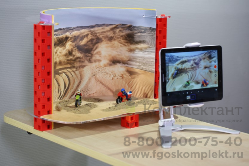 Особенностью набора является возможность трансформировать съемочную площадку под творческие задачи оператора. Это достигается использованием в качестве строительного материала пластиковых кубиков со специальным креплением. Данное решение допускает широкое применение элементов набора «2.1.29. Модели раздаточные по математике для начальных классов» для создания подвижных платформ.