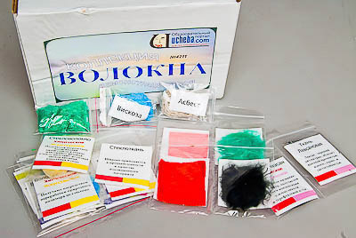 Коллекция включает образцы волокон и изготовленных из них тканей. Образцы разложены в пакеты с этикетками, содержащими название образца, тип волокна и краткую информацию о его свойствах, получении и применении. Также коллекция включает образцы волокон (расфасованы в маленькие пакетики с этикетками), предназначенные для расходования при проведении опытов по идентификации волокон и определении их свойств. Пособие комплектуется руководством по эксплуатации и ламинированным вкладышем, содержащим классификацию волокон, информацию об их свойствах, производстве и применении.