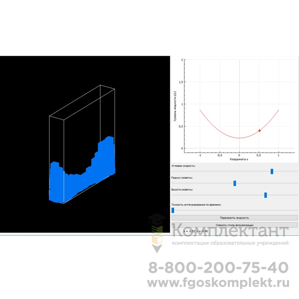 Программное обеспечение для моделирования поведения жидкости во вращающемся сосуде позволяет задавать размеры (высоту и радиус) вращающегося сосуда, а также угловую скорость вращения. Результаты расчета представляются графически в виде сечения поверхности жидкости плоскостью, проходящей через ось вращения, а также в виде 3D-анимации, показывающей изменение формы поверхности жидкости при уменьшении или увеличении частоты вращения.