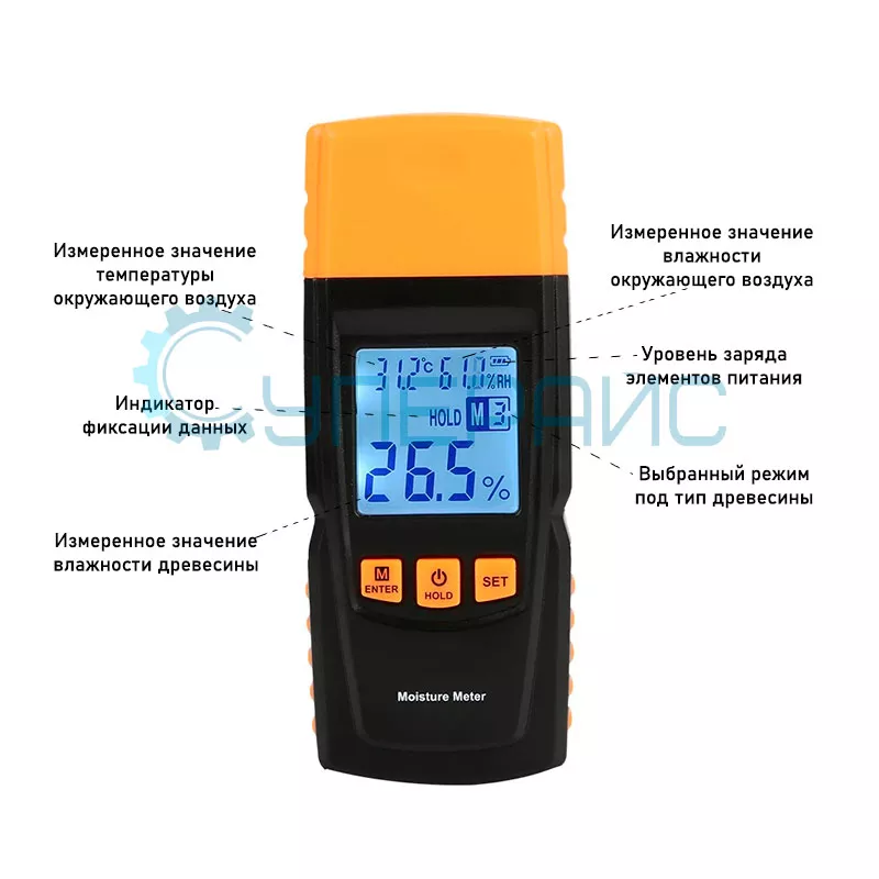 Тестер определяет сопротивление между 2-я иглами и способен измерять относительную влажность (40%, 50%, 60%, 70%). Легко лежит в руке и удобен в транспортировке. Инструкция по эксплуатации влагомера древесины представлена во вкладке «Документация и ПО» на русском языке.