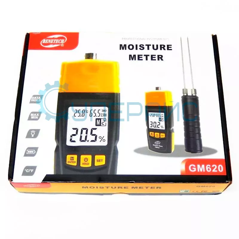 Контактный игольчатый измеритель Benetech GM620 определяет относительную влажность различных материалов: древесины, ДВП, ДСП, бумаги, картона, бетона и т. д. Прибор отличается компактностью, надежностью и легкостью использования.