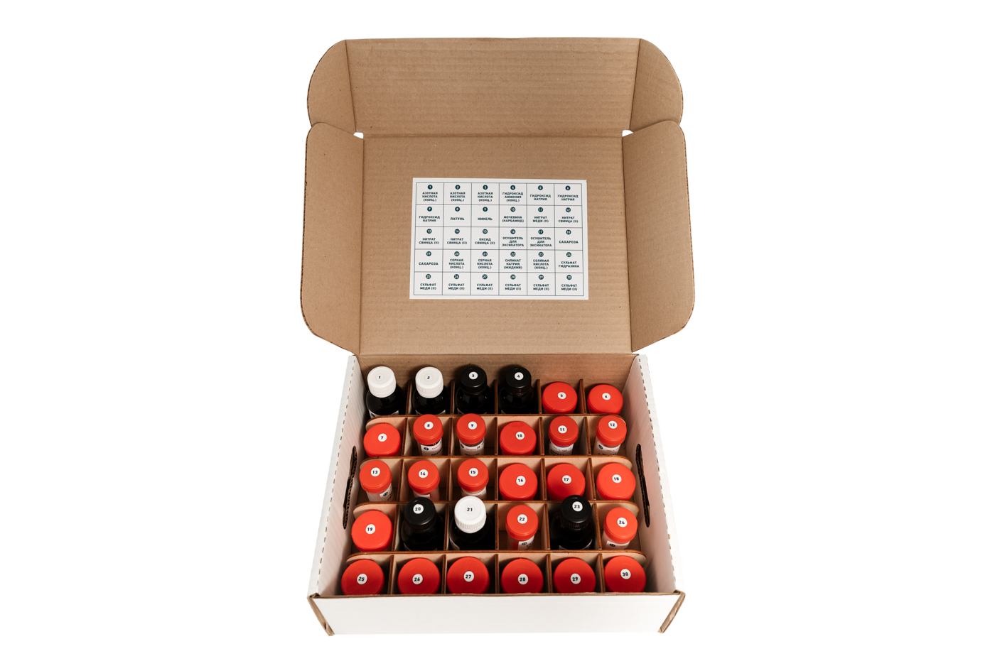 Набор поставляется в двух картонных коробках с деревянными ложементами, внутри которых находятся реактивы в контейнерах и флаконах для хранения, лабораторная посуда и принадлежности.